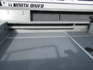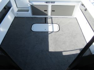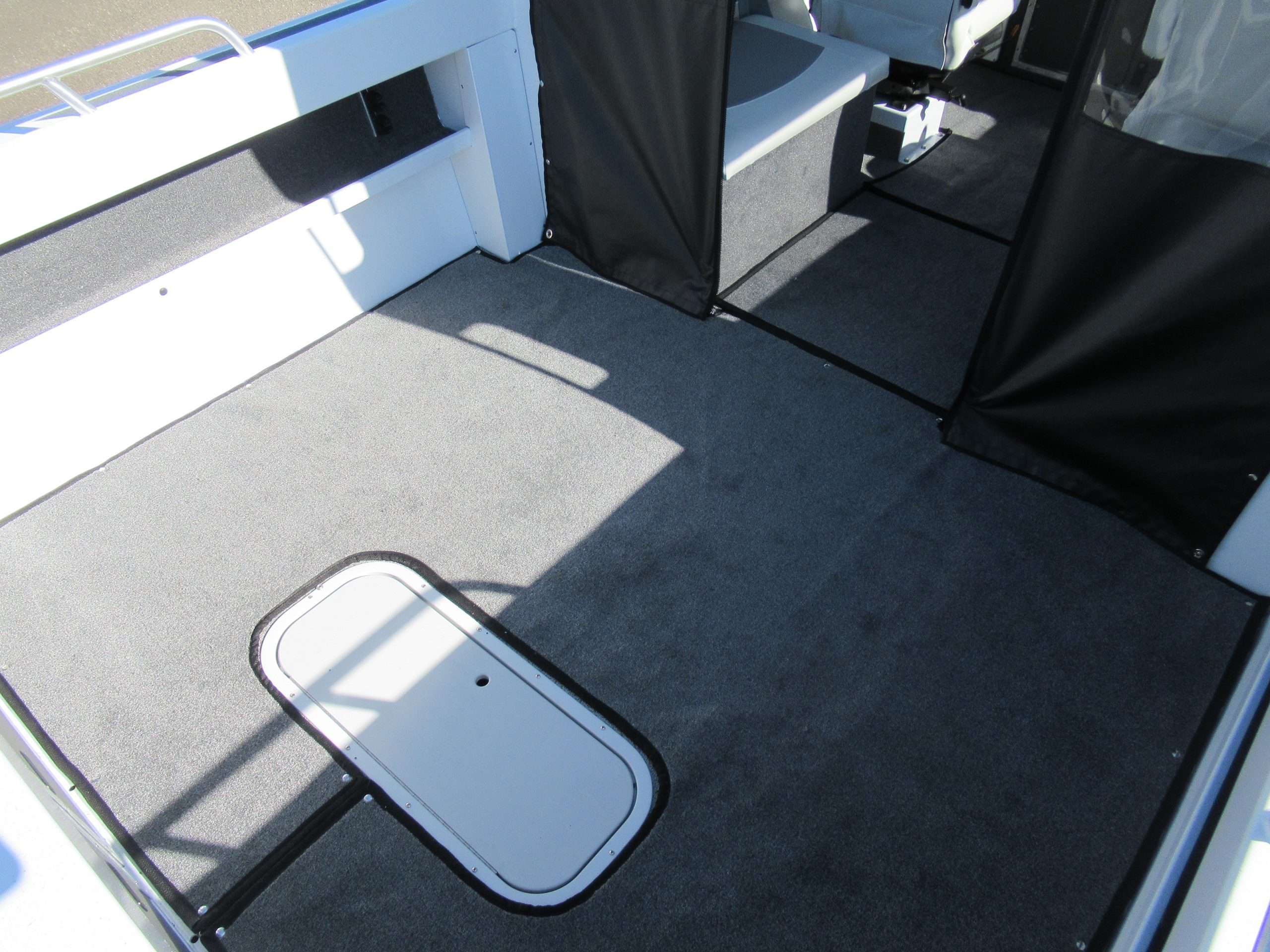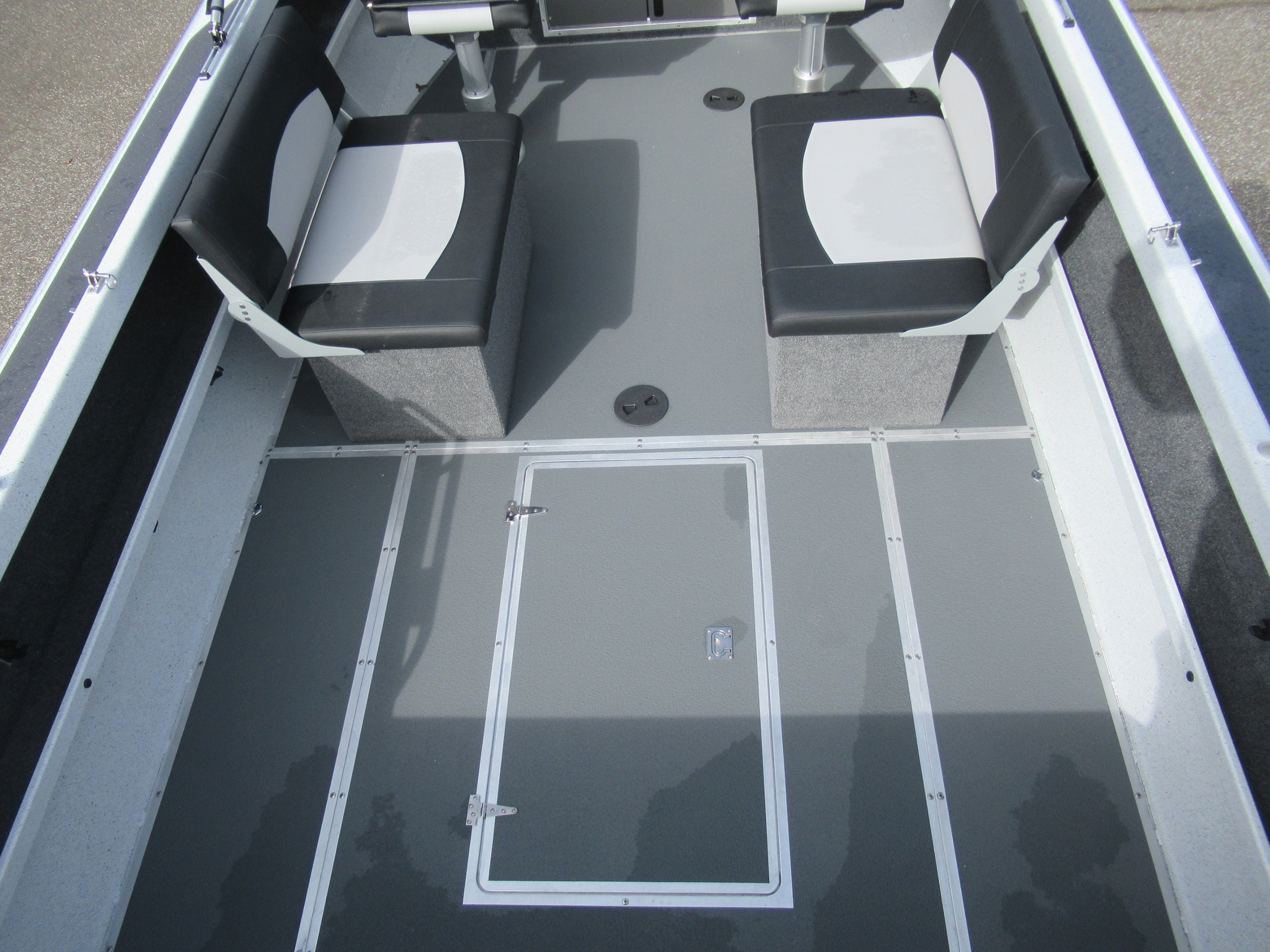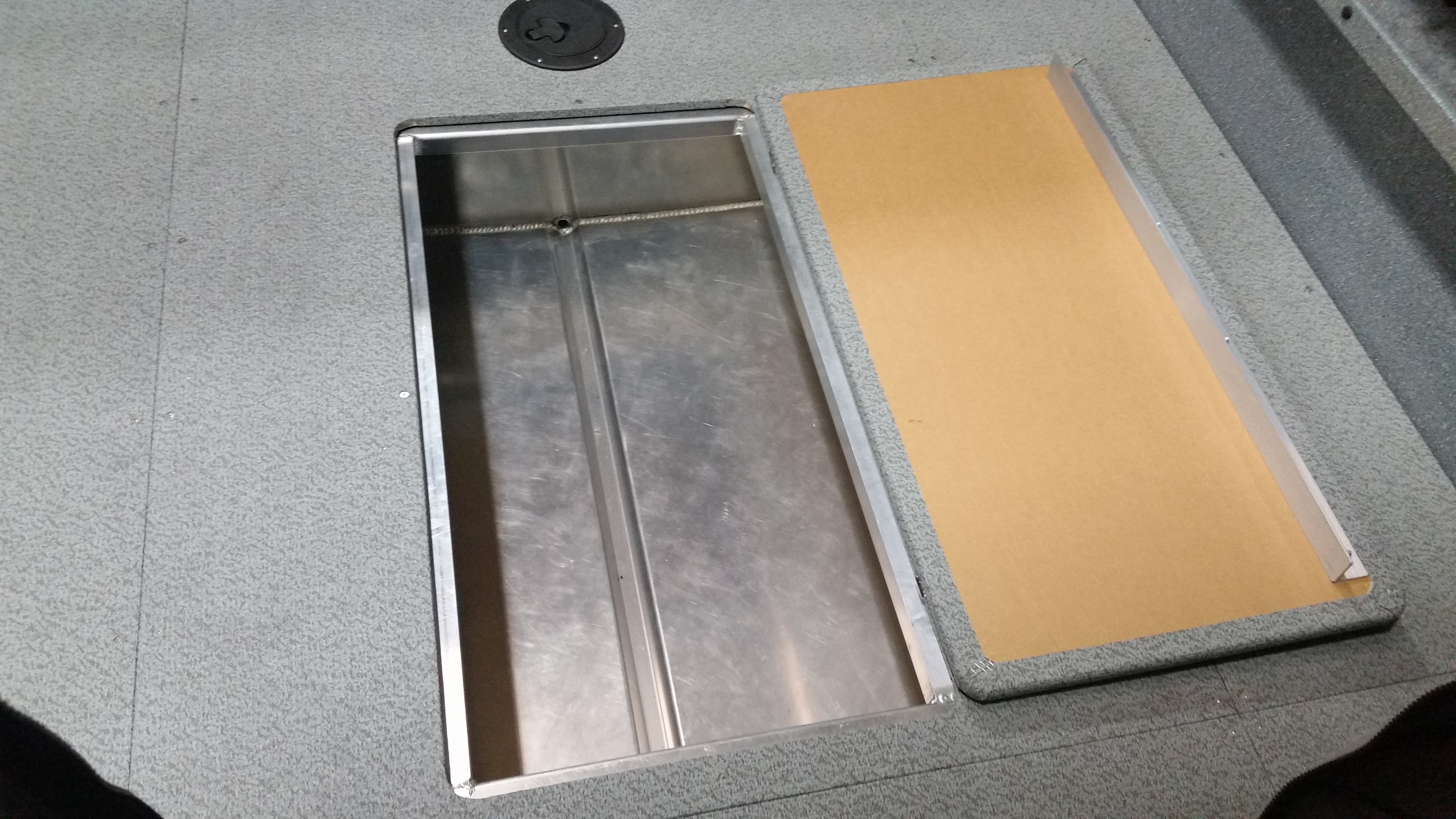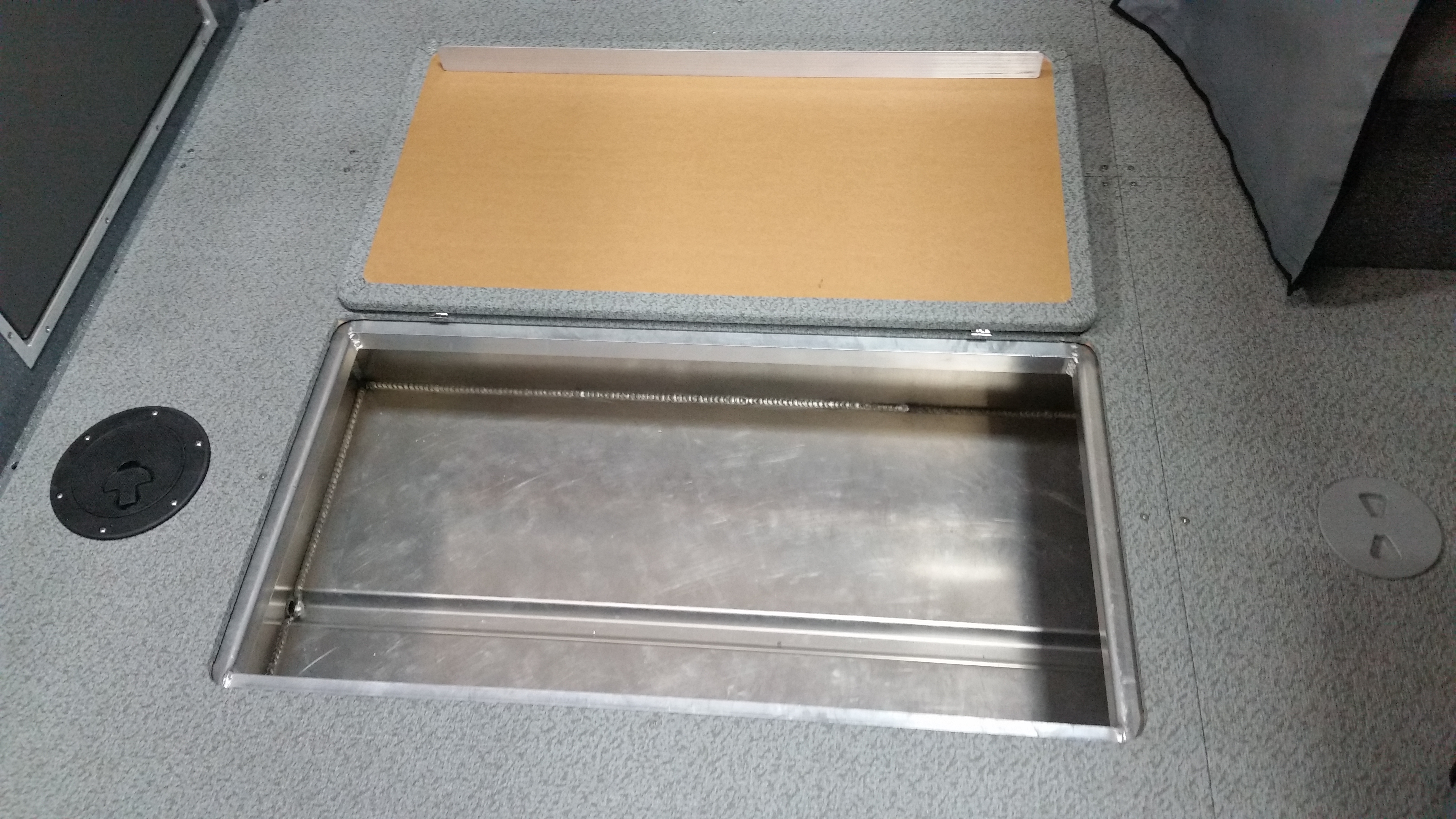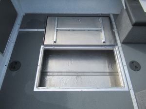 - Fish box welded in floor, hinged door, with drain and valve