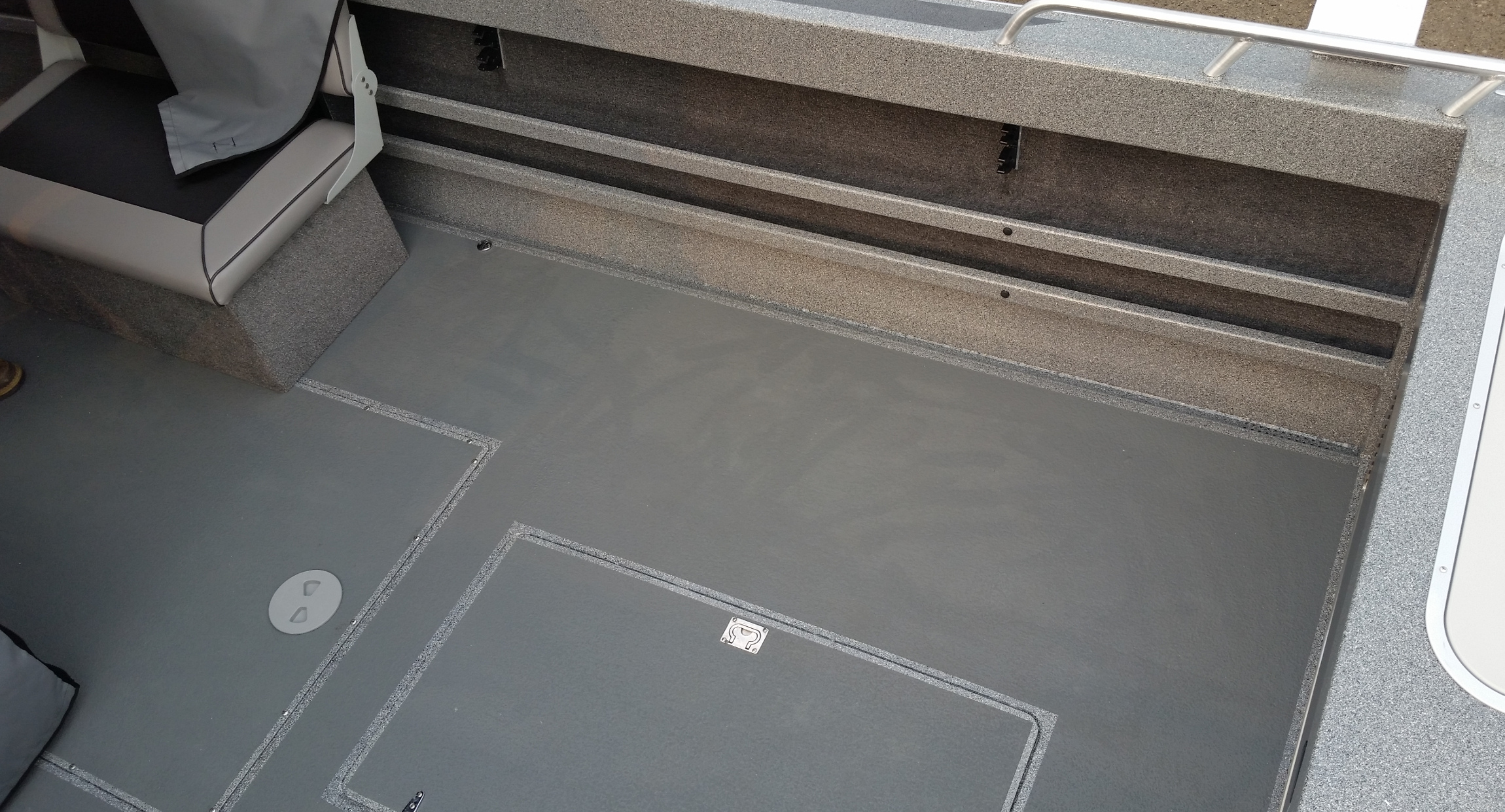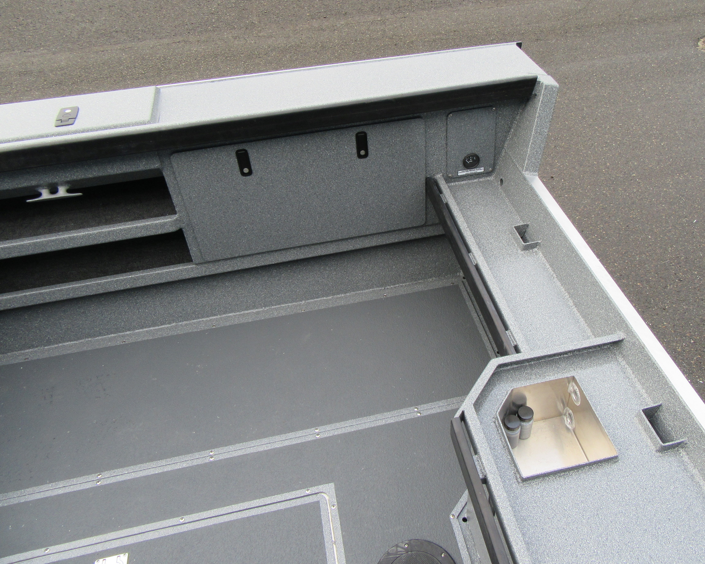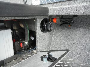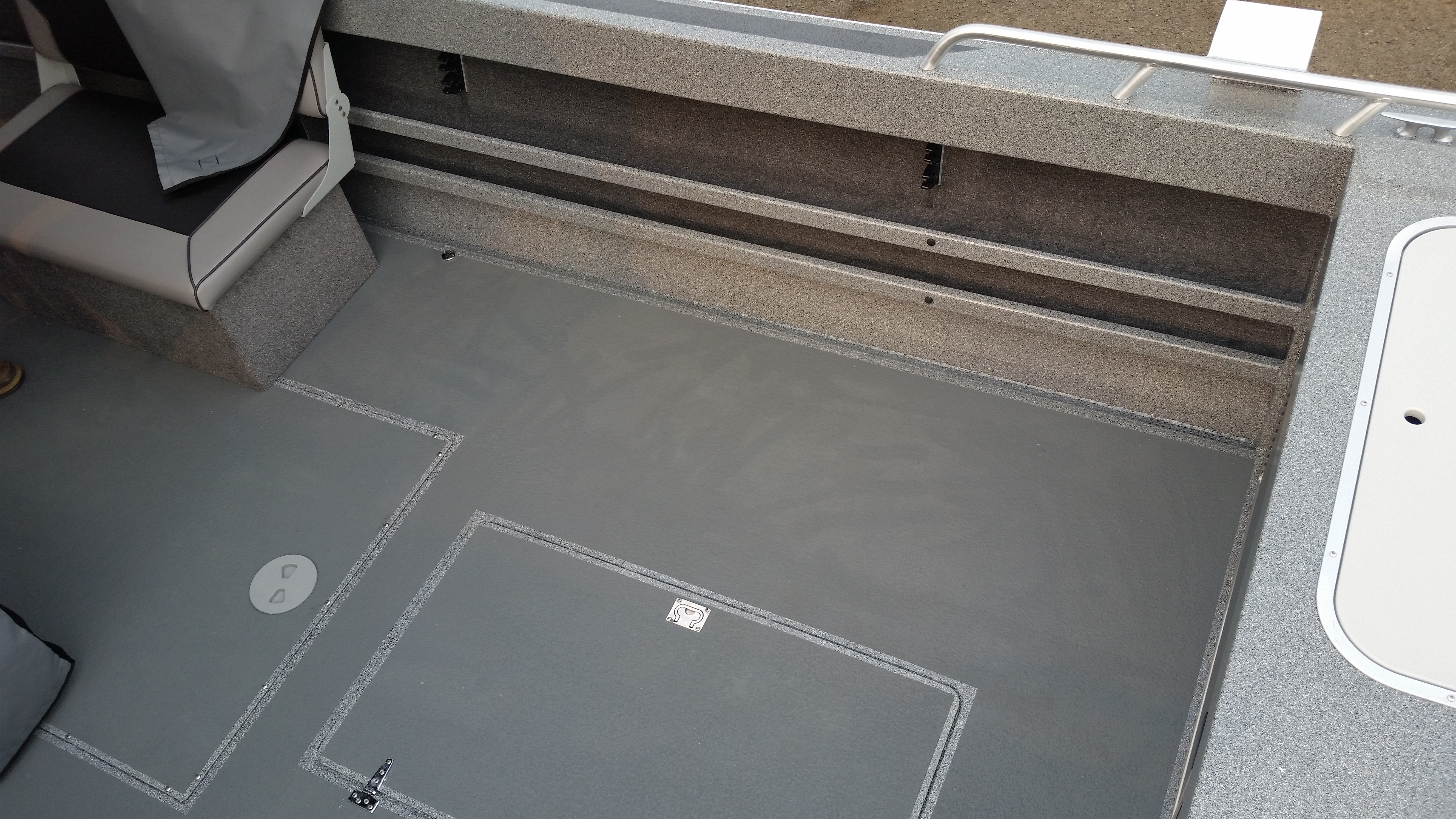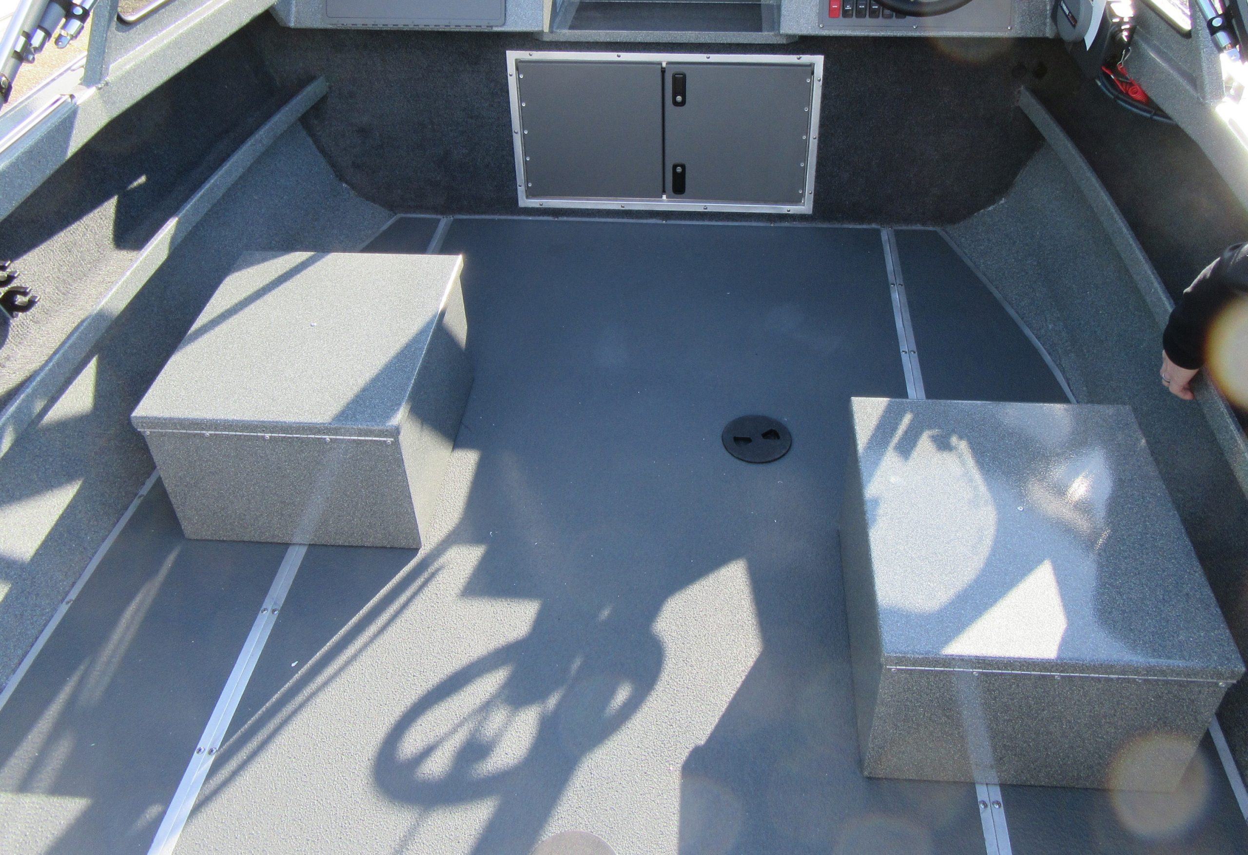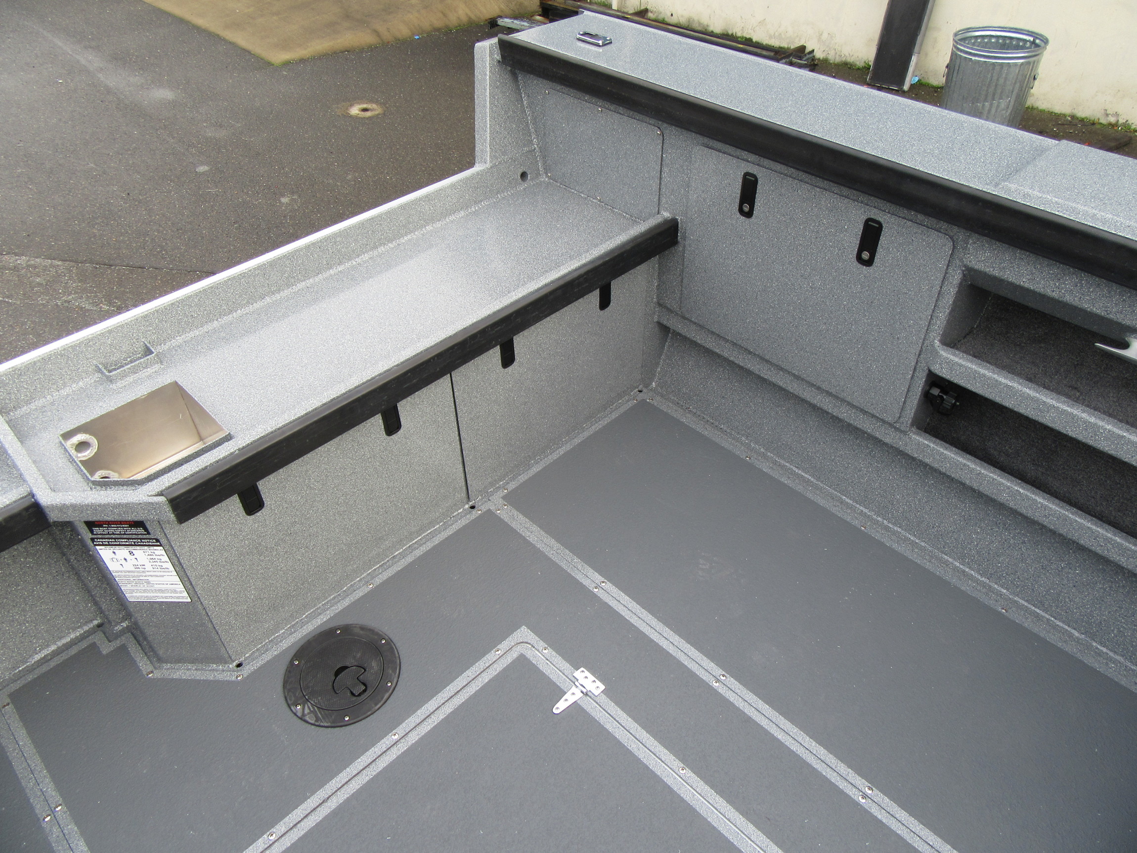 - Fish box welded in floor, hinged door, with drain and valve